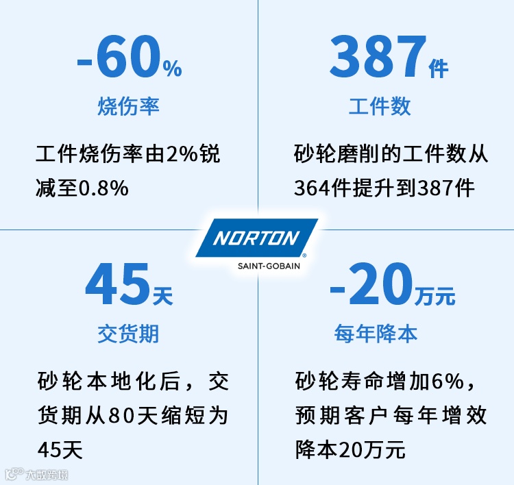 经过圣戈班诺顿工程师对磨削参数进行调试后,加快了加工节拍,提升了磨削效率和生产效率,减少了磨削能耗和磨削时间,并解决了工件烧伤问题: