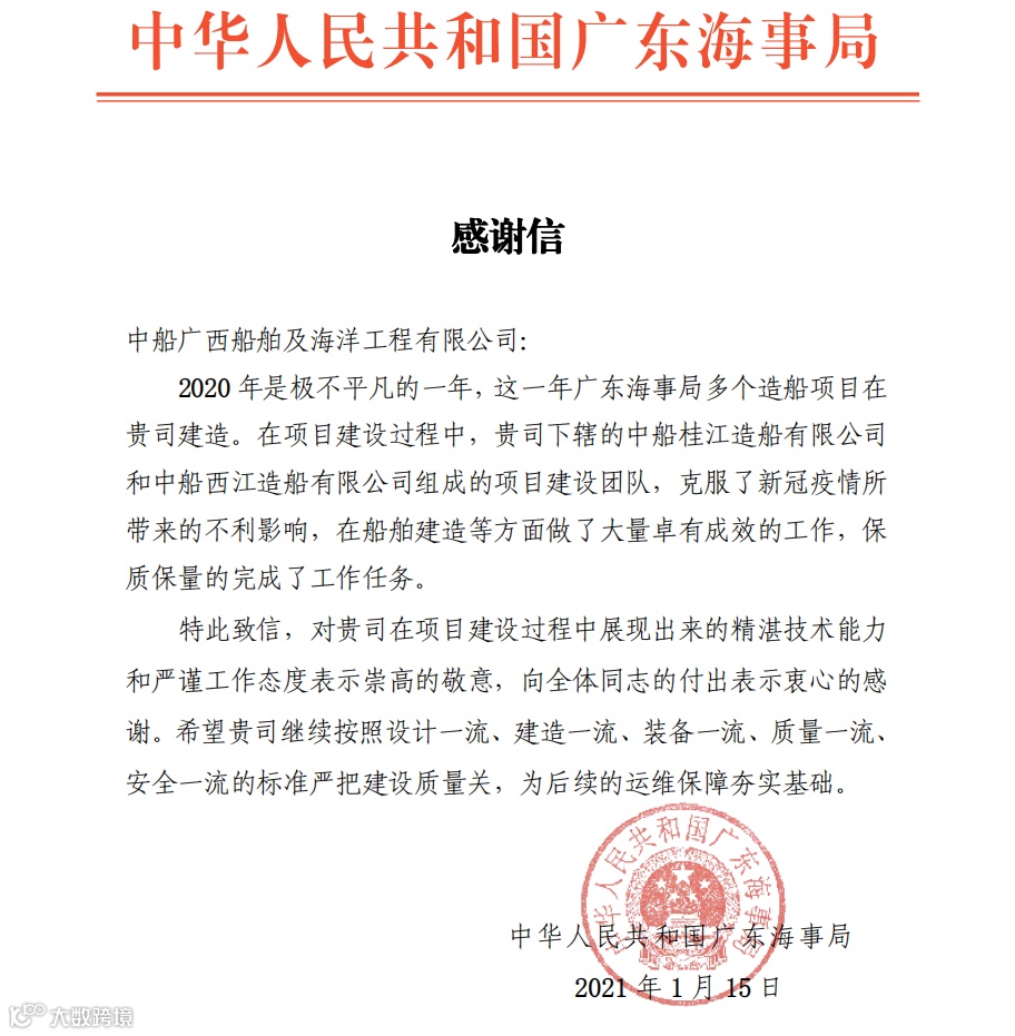 近年来,中船广西公司携旗下子公司为海事系统承建了多型诸如海事60米、40米、30米、20米巡逻执法船,以“设计一流、建造一流、质量一流、安全一流、服务一流”的工作理念,为广西、广东、浙江、山东、澳门等海事局交付装备一流的船舶,多次赢得船东的高度赞誉。今后,公司将继续坚守初心,牢记强装兴企使命,为海事系统建造更多优质船舶。