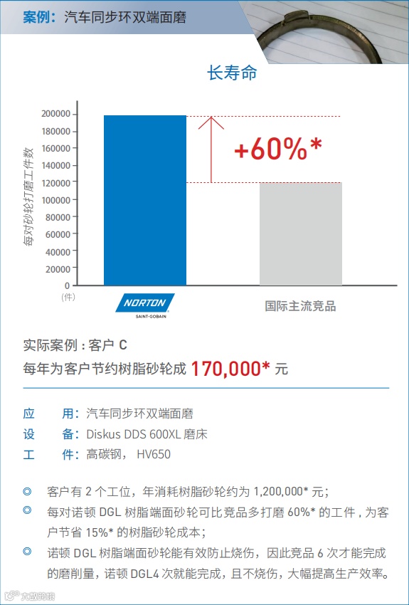 为此,圣戈班工程师向该企业推荐了享有“红金刚”美称的圣戈班诺顿解决方案——诺顿DGL树脂端面磨砂轮产品,从而助力同步环高效磨削再上“新台阶”。