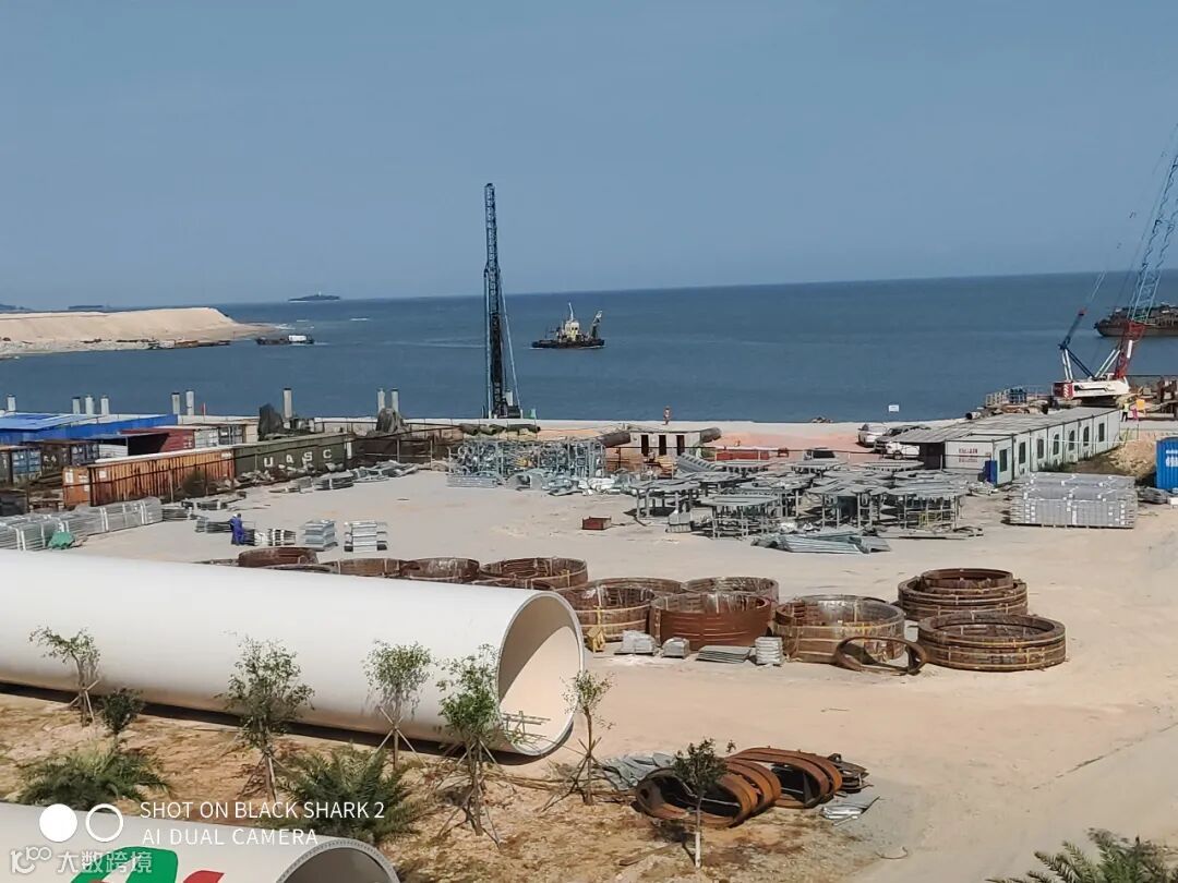 现场生产热火朝天,物资保障紧跟上。防疫期间,面对劳动力不足、物资及承包商不能按时到位等诸多困难,公司保障项目组组织精干力量,经过两个月的紧张施工,按期完成了120t门座机基础建设、1万多平方的堆场地坪建设及100个水泥坞墩预制。目前,风塔车间涂装房延长工程也在有条不紊地推进。