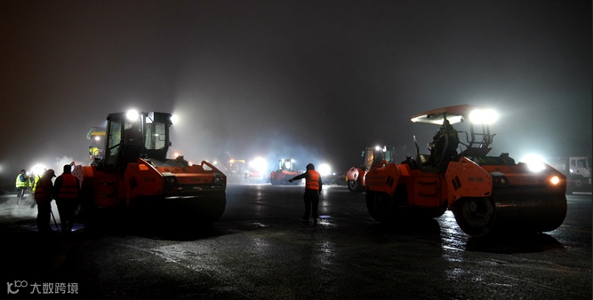 加上 7 台悍马大型双钢轮压路机联合作业,在每日不到 5 个小时的施工窗口期,铺设混凝土日均 400-600 吨,施工品质和效率受到了多方认可。
