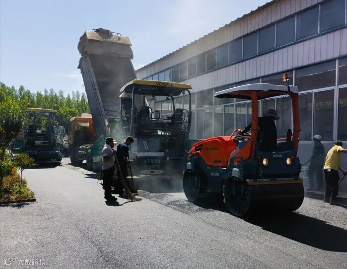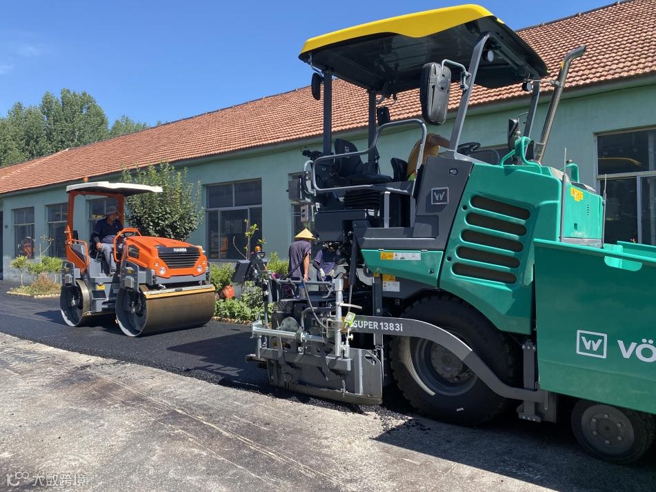 亮点:此次施工中,超级 1383i 配合一台福格勒通用型摊铺机罩面,与悍马小型振荡压路机 HD 50 VO 及 悍马 HD 30 VV 高效协同作业,在厂区内幅宽较大区域采取双机并铺。超级 1383i 摊铺出的面层与福格勒通用型摊铺机的摊铺效果别无二致,平整度和密实度都让用户非常满意。