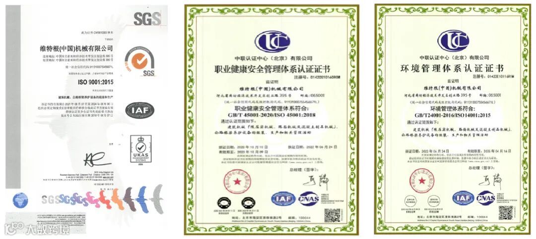 2018年,维特根中国廊坊工厂就初次通过ISO9001:2015《质量管理体系要求》认证;其后又分别通过了GB/T 45001-2020/ISO45001:2018《职业健康安全管理体系要求及使用指南》认证,GB/T 24001-2016/ISO14001:2015《环境管理体系要求及使用指南》认证……
