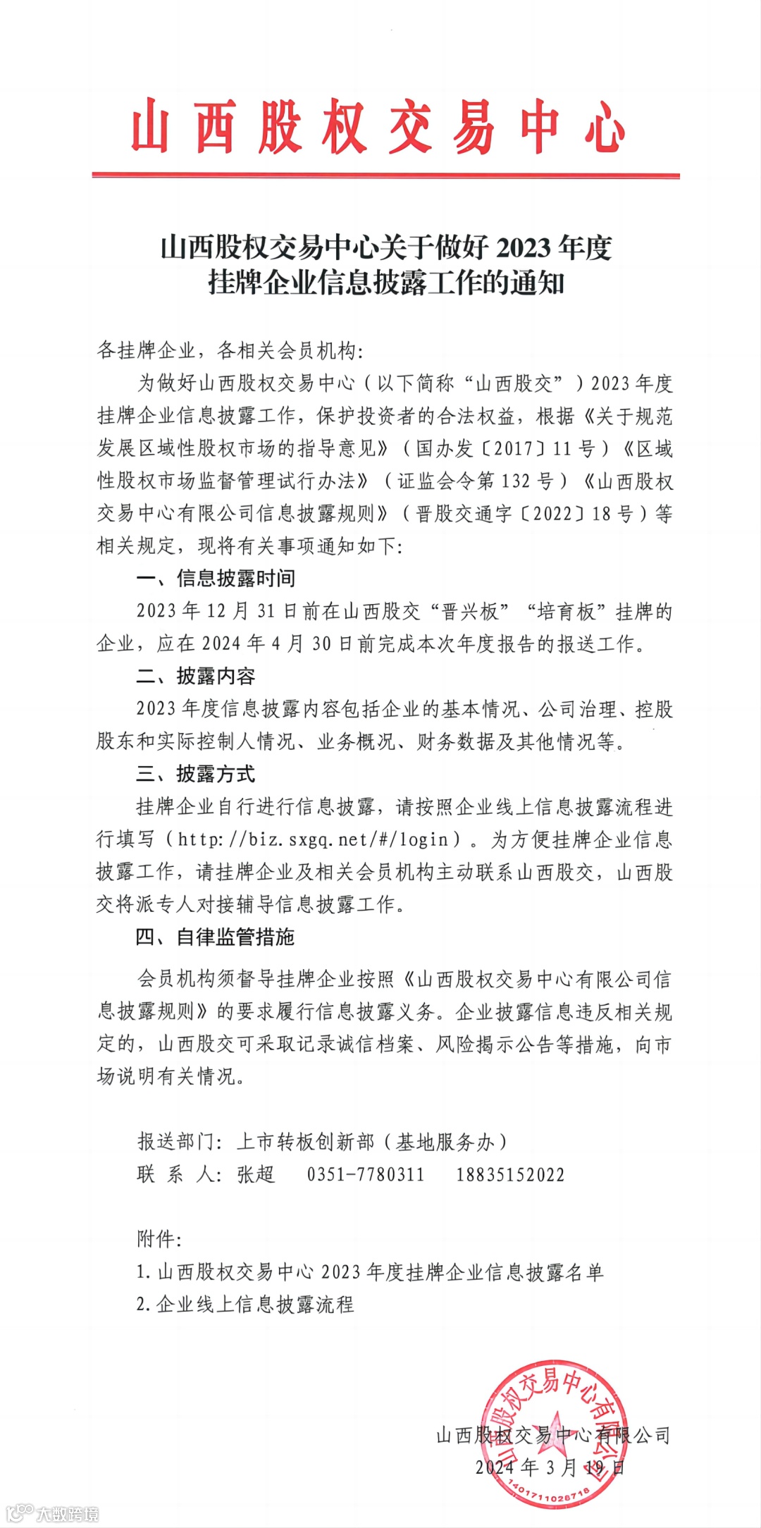 根据《关于规范发展区域性股权市场的指导意见》(国办发〔2017〕11号)《区域性股权市场监督管理试行办法》(证监会令第132号)《山西股权交易中心有限公司信息披露规则》(晋股交通字〔2022〕18号)等相关规定,拟开展2023年度挂牌企业信息披露工作,涉及企业1481家,其中晋兴板企业1342家,培育板企业139家。现向挂牌企业及各会员机构发送《山西股权交易中心关于做好2023年度挂牌企业信息披露工作的通知》,督促企业及各会员机构按时开展信息披露工作。