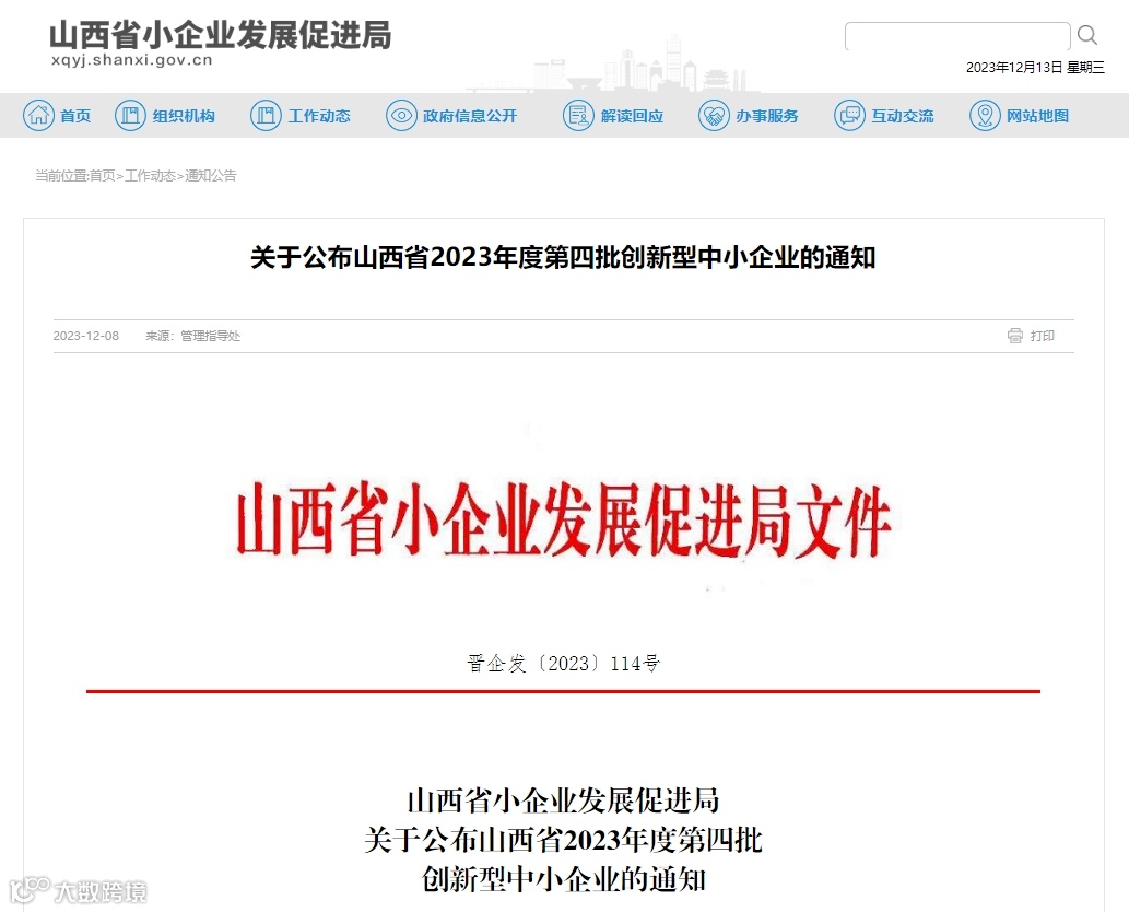 山西省2023年度第四批创新型中小企业名单公布