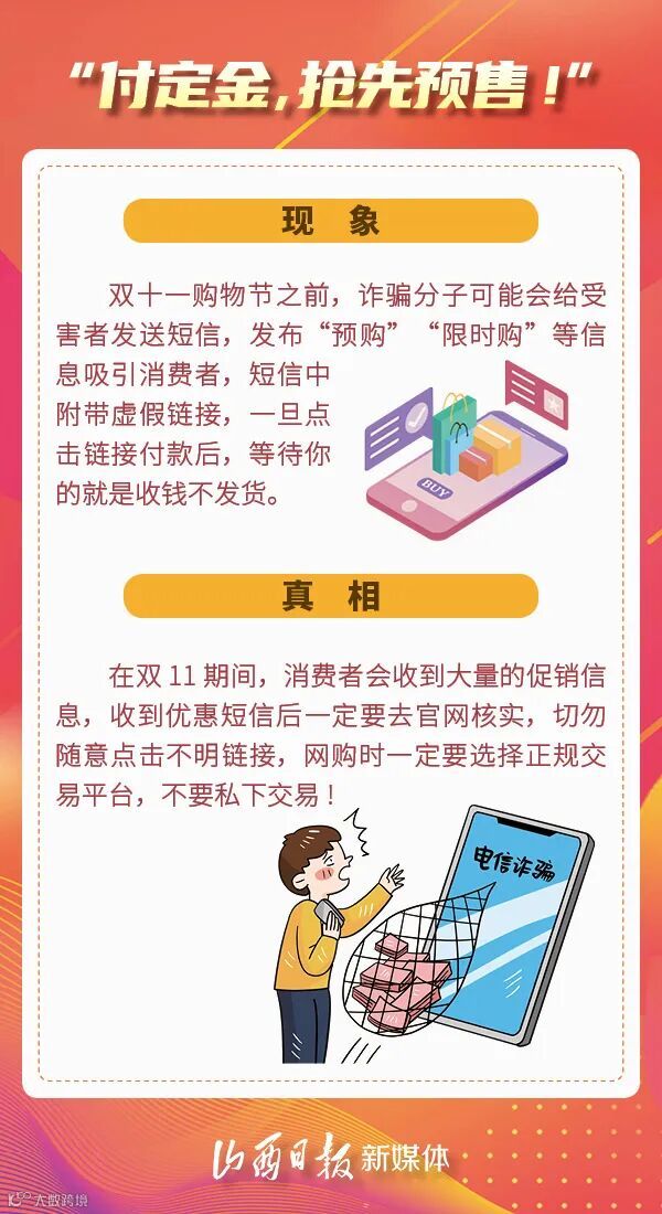 随着一年一度的“双十一”电商购物节临近,各大电商平台也都开始开启不同形式的促销预热活动,与此同时,不法分子也在伺机而动,为了避免大家落入骗局,下面为大家盘点近期出现的新型诈骗套路,戳穿骗子的真面目,守护好你的钱袋子。