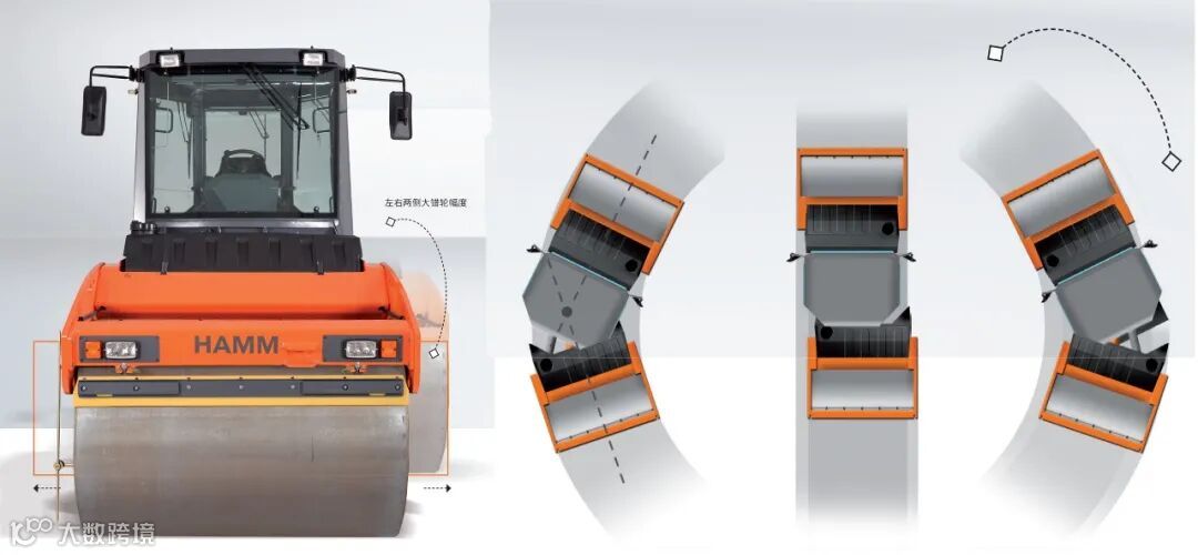 精确、安全地施工是保证项目质量,保障机手及其他工作人员人身财产的重要环节。而悍马HD 系列压路机的三点铰接机构,确保了机器极佳的行驶稳定性,优异的转向性能及理想的行驶舒适性。即使在最大的转向角度下,3 点铰接机构也能够确保机器前部和后部均匀的重量分布,有效防止沥青的位移及侧向变形,从而压实出理想的沥青路面。另外,3点铰接机构也显著降低了机器在弯道处的侧倾风险。另外,在所有行驶模式下,钢轮可以实现左右两侧大错轮幅度,这确保设备可以紧贴障碍物边缘充分压实。在下图中,我们也可以清晰看到,有一台压路机正在紧跟大部队执行贴边压实任务,确保了压实无遗漏。