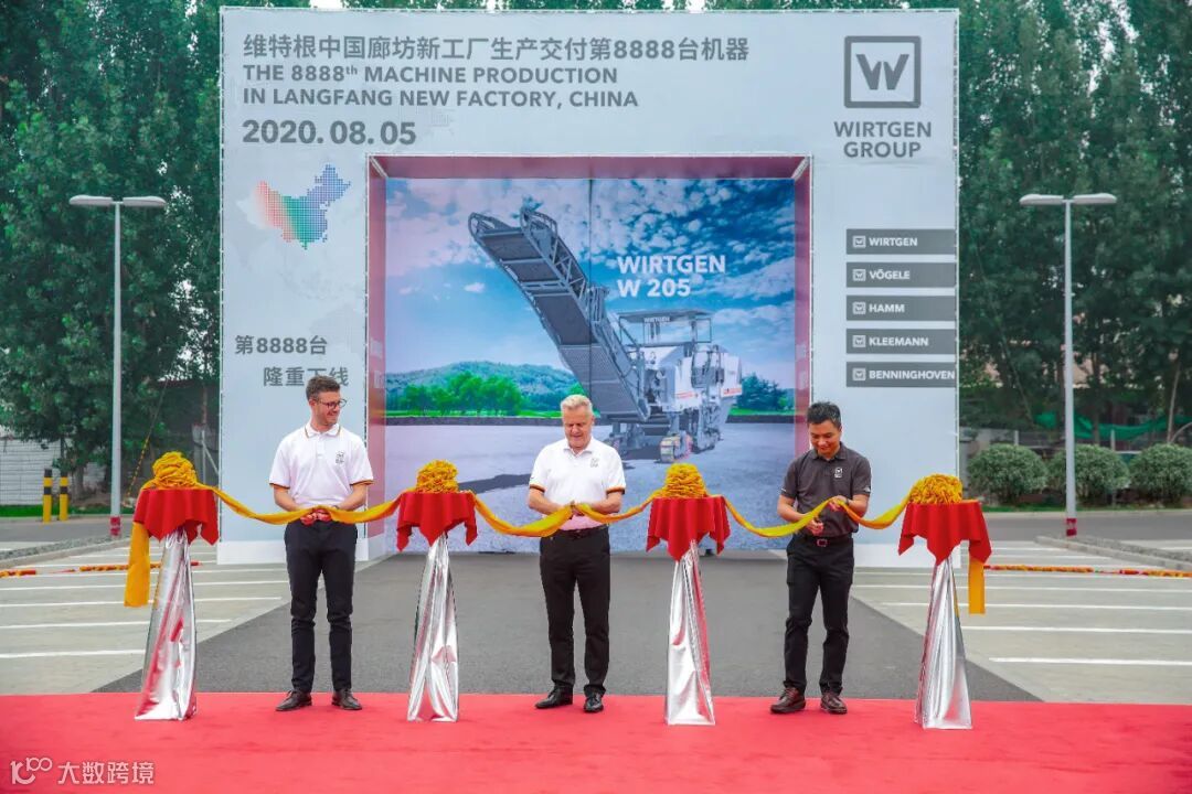 维特根中国总裁韦策图(中)与维特根中国首席运营官Carl Doering(左),维特根中国路面业务销售总监虞勇智(右)为第8888台设备出厂剪彩