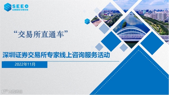 11月18日,深交所山西基地成功举办“交易所直通车”-深圳证券交易所专家线上咨询服务活动(第三期)。此次活动由省金融办、山西证监局指导,山西股权交易中心基地服务办承办,诚邀深交所北方市场服务中心区域主任杨继东、北方中心陈航航为企业“问诊把脉”,两家省重点上市后备企业精英数智、凝固力相关负责人参加活动。