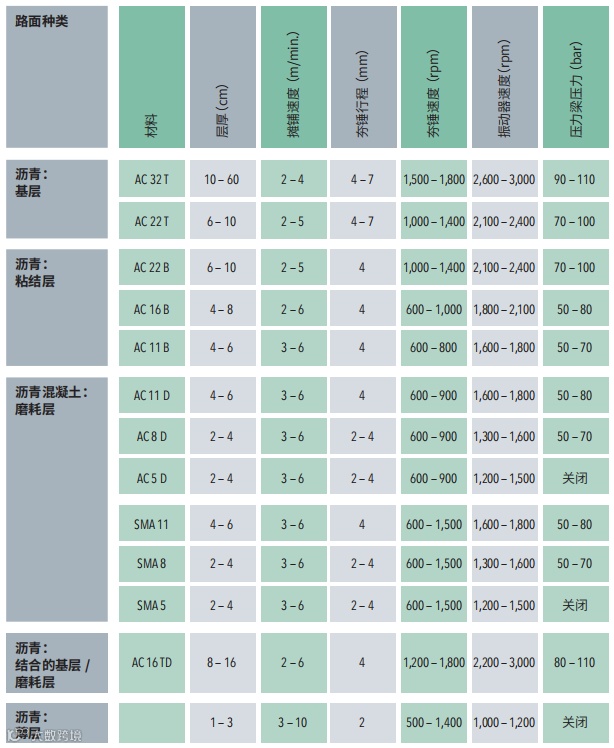 当然,根据工况不同,设置摊铺机及熨平板的摊铺参数,是摊铺出高质量层面、路面的关键,下面小维就为大家附上一表《摊铺参数设置参考》希望对大家有所帮助。