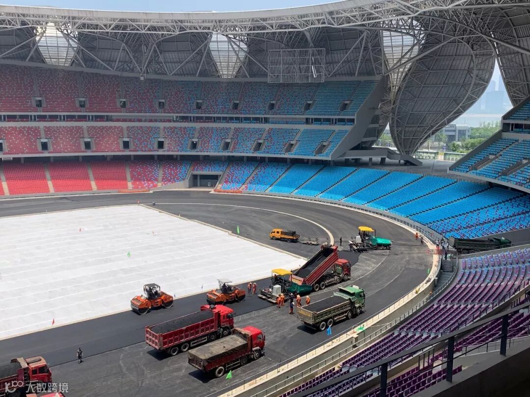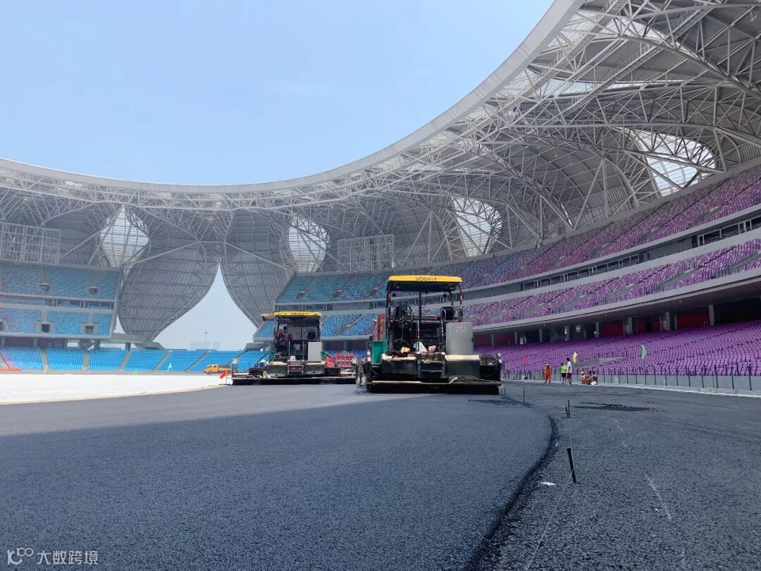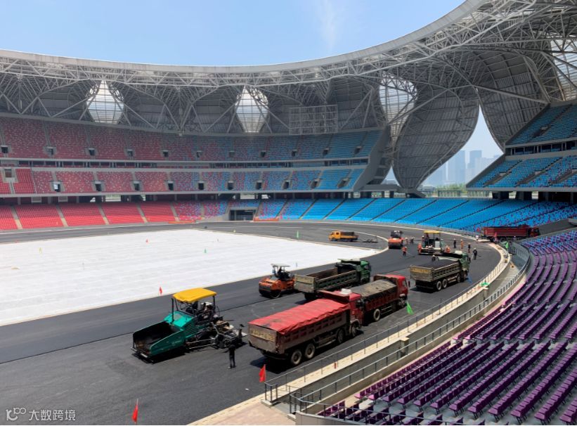 目前,这个外观由28片大花瓣和27片小花瓣组成的花瓣单元,场馆内部装修已基本完工,正陆续安装建设一些为体育赛事服务的功能性设备,LED大屏、塑胶跑道和草坪等。与此同时,2019年6月28日,为期三天、总摊铺面积近1.2万平方米的杭州奥体中心主体育场跑道沥青基础工程也循序渐进的完成施工。
