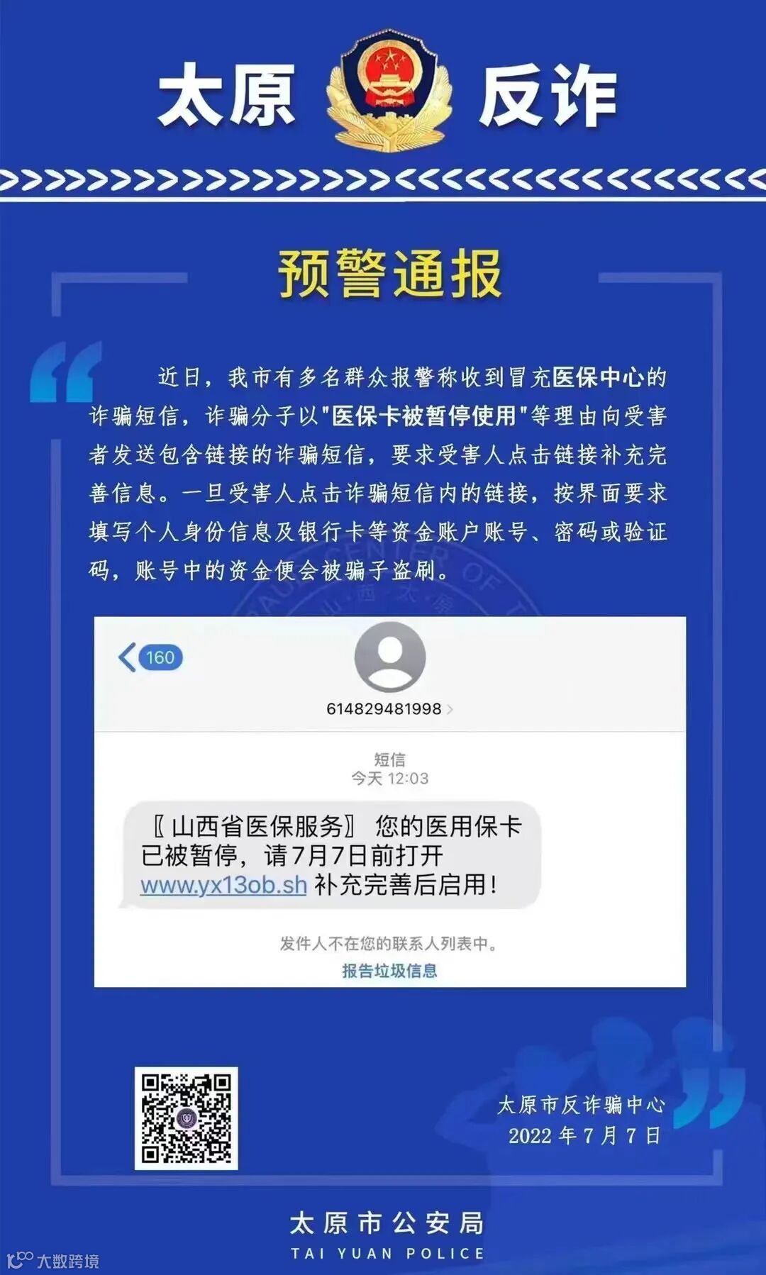 近日,我市有多名群众报警反映,收到冒充医保中心的诈骗短信,诈骗分子以“医保卡被暂停使用”等理由向受害者发送包含链接的诈骗短信,要求受害人点击链接补充完善信息。仅7月7日一天,全市就有12人因点击链接被骗,损失最大的一人被骗走4万余元。