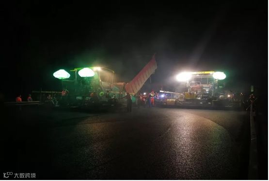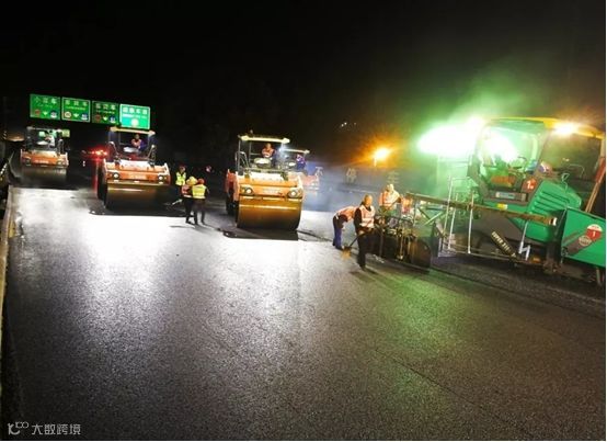 铣刨作业面完成后,罩面组立即进行面层摊铺,期间还需进行同步碎石封层等工艺施工。据刘满成介绍,此次摊铺作业面宽度为 15.3 m,摊铺厚度为面层罩面 4 cm,每晚待病害处理后工作小时仅剩3-4小时。为保障工程尽快完成,每个作业面日均摊铺面积需达到7000-10000平方米,同时要求施工完成后施工设备于每日凌晨6点前必须转运至服务区等指定地点停放,保障道路顺利通行。