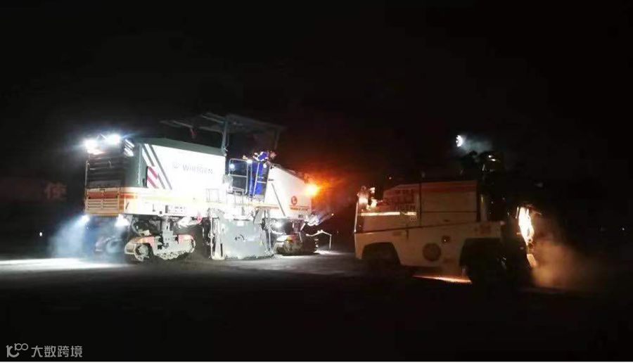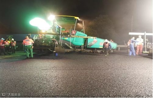 铣刨是路面维修第一步,在铣刨掉破损面层后,再铺设新的沥青面层。这一阶段采用福格勒摊铺机双机并铺方式,其中福格勒超级 2100-3 L 是“-3”系列大型摊铺机的代表机型之一,具有超强摊铺能力,操作智能,摊铺精度高。最大摊铺宽度达 13 m,最大摊铺能力 1100 t/h,并且配置低排放套包,施工过程低油耗、低噪音,经济、环保、低碳。