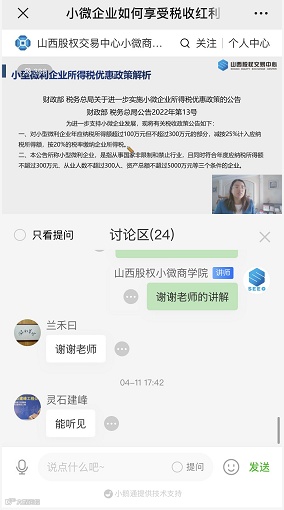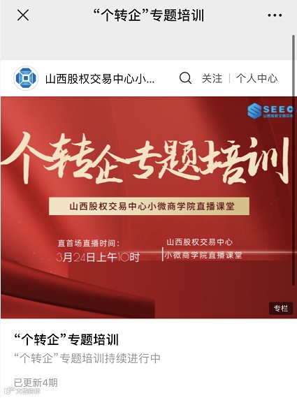 欢迎各位有意向转企的个体工商户关注小微商学院线上直播课堂,我们将为您的转企之路插上翅膀,助您飞向更广阔的舞台!山西股权交易中心小微商学院将继续推出资本市场精彩课程,畅通企业家与资本市场的沟通渠道,后续活动敬请期待!