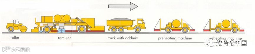 施工过程中的主要环节为:标线处理及路面清洁,路面加热,路面耙松,再生材料拌合、摊铺以及碾压。