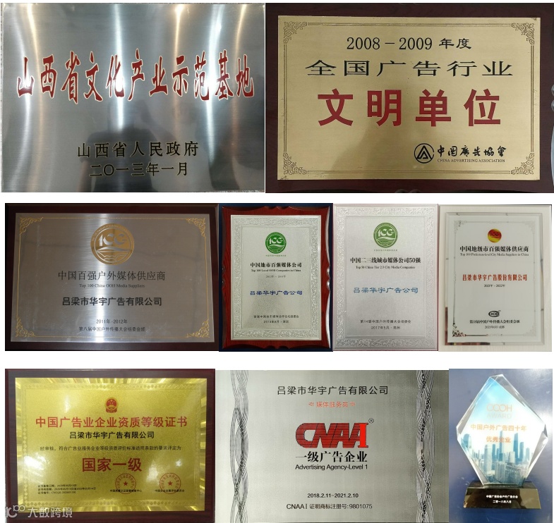 多年来,公司致力于企业的形象塑造及自身形象推广,迅速崛起并饮誉吕梁大地,被中国广告协会、中国工商业联合会、中国策划协会吸收为会员单位。公司先后被评定为“中国一级广告企业”、“全国广告行业文明单位”、“国家级守合同重信用企业”、“中国广告行业百强”、“中国二三线城市媒体公司50强”等荣誉称号。被山西省人民政府命名为“山西省文化产业示范基地”,被中国广告协会评为“中国户外广告40年优秀企业”。