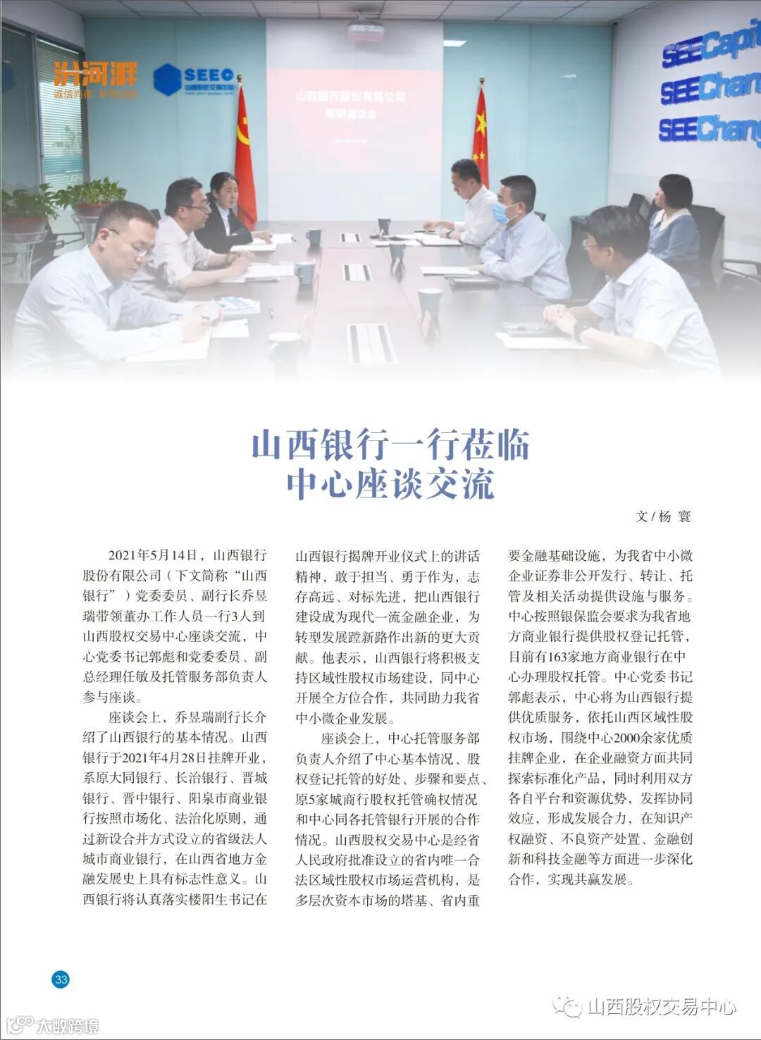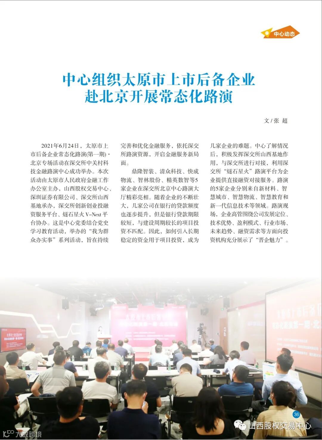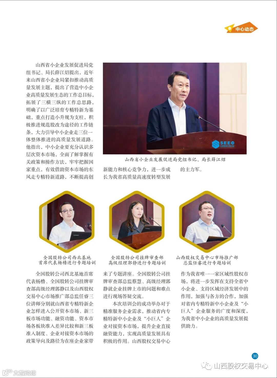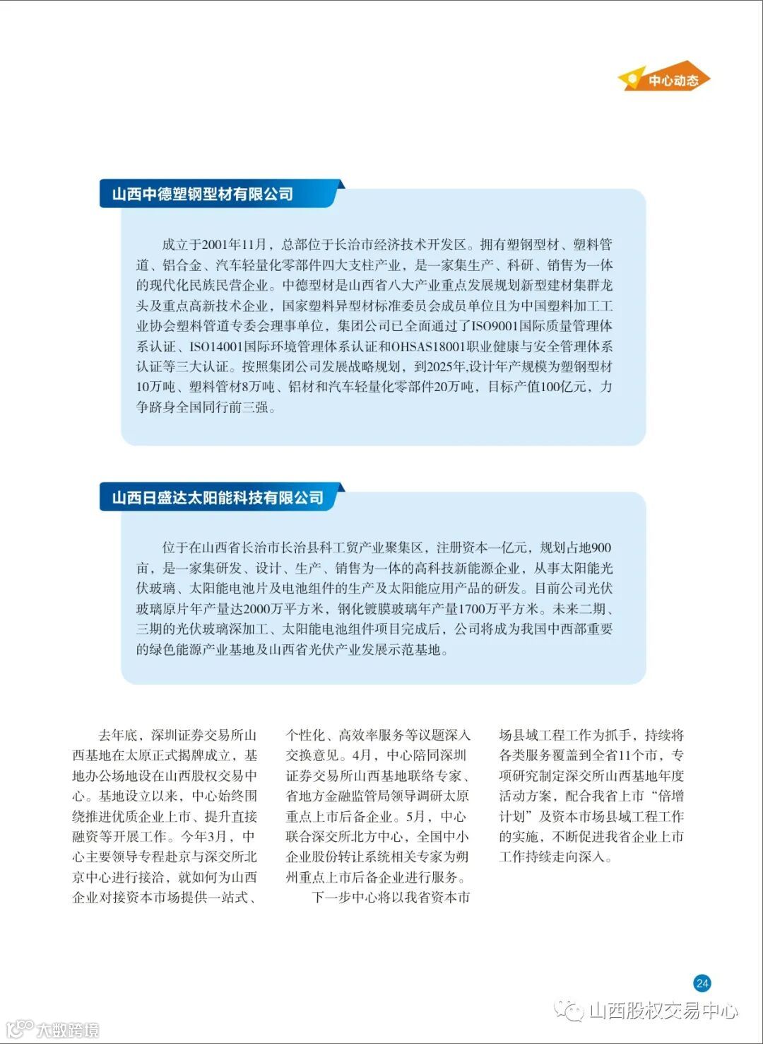 山西股权交易中心是经山西省人民政府批准设立的省内唯一的区域性股权市场运营主体,专注为省内中小微企业提供改制辅导、融资转让、财务顾问、信息咨询、管理培训、路演宣传、上市培育等全方位个性化金融服务,赋能地方实体经济和中小微企业高质量发展。