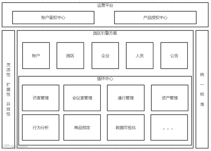 架构层面设计采用,1个园区基础块+多个插件业务块组成,定义统一的协议标准、统一的业务标准,统一的技术标准,达到后续业务开放共享的标准,建立以园区平台为核心的业务开放平台。