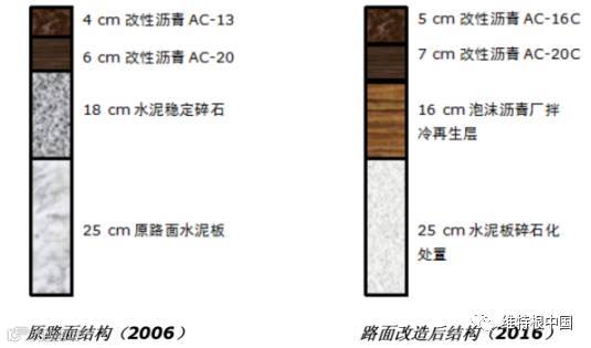 为彻底改善该路段的路面使用性能,2016年的改造设计方案采用了“水泥混凝土板碎石化+泡沫沥青冷再生+双层改性沥青面层”的路面结构,即在对原水泥混凝土板进行碎石化处理后,用16 cm泡沫沥青冷再生层代替原来的18 cm水泥稳定碎石层,同时加铺两层改性沥青面层,改造后路面标高维持与改造前一致。