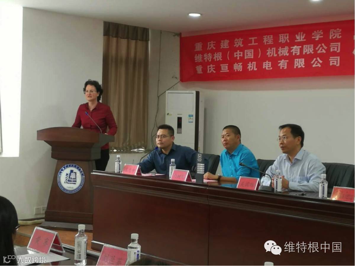 维特根(中国)机械有限公司 市场总监 Claudia Fernus 女士与重庆建筑工程职业学院院长吴国雄、重庆亘畅机电有限公司董事长赵树刚先生签订校企合作协议