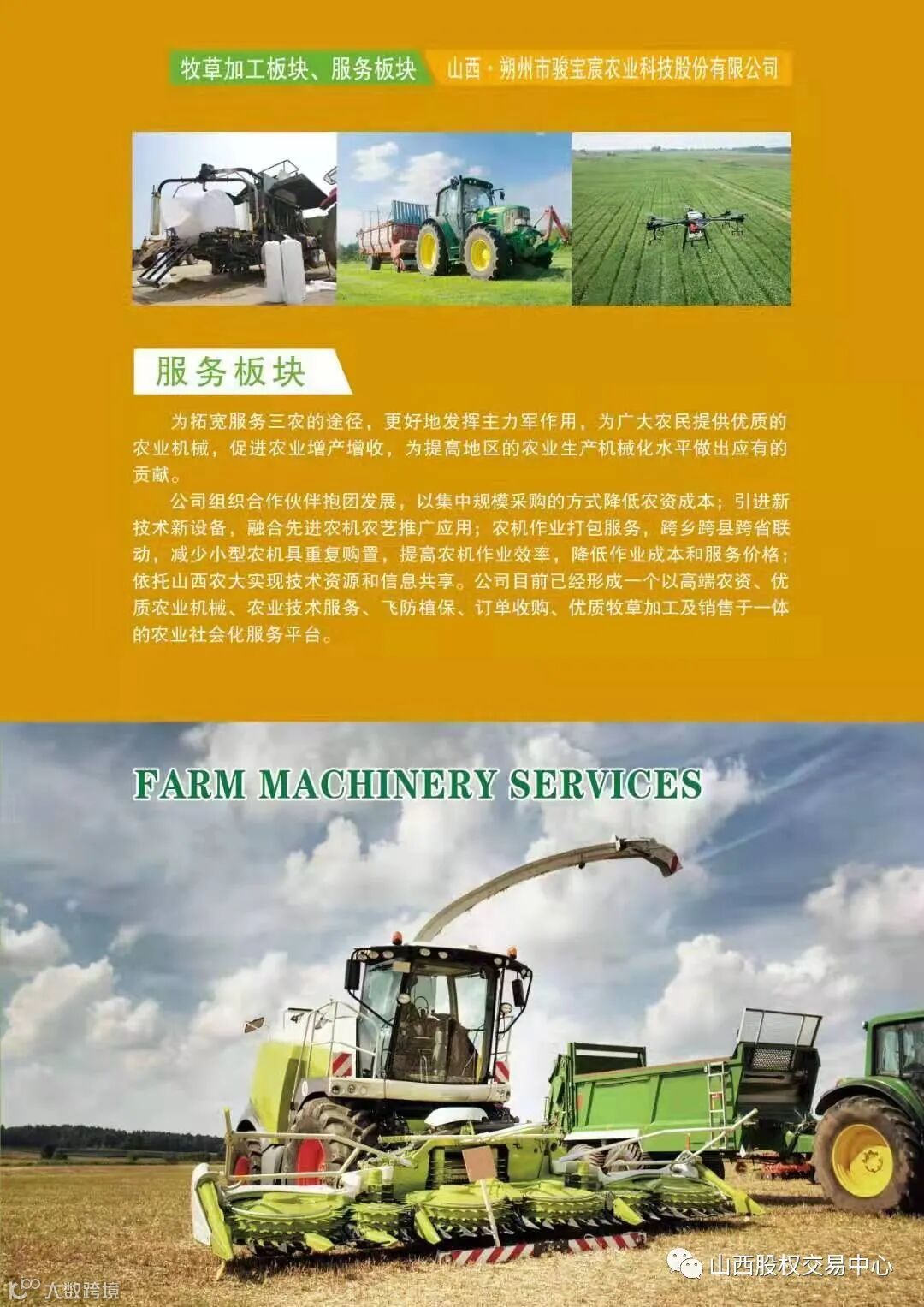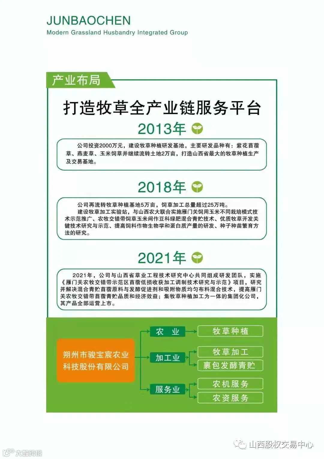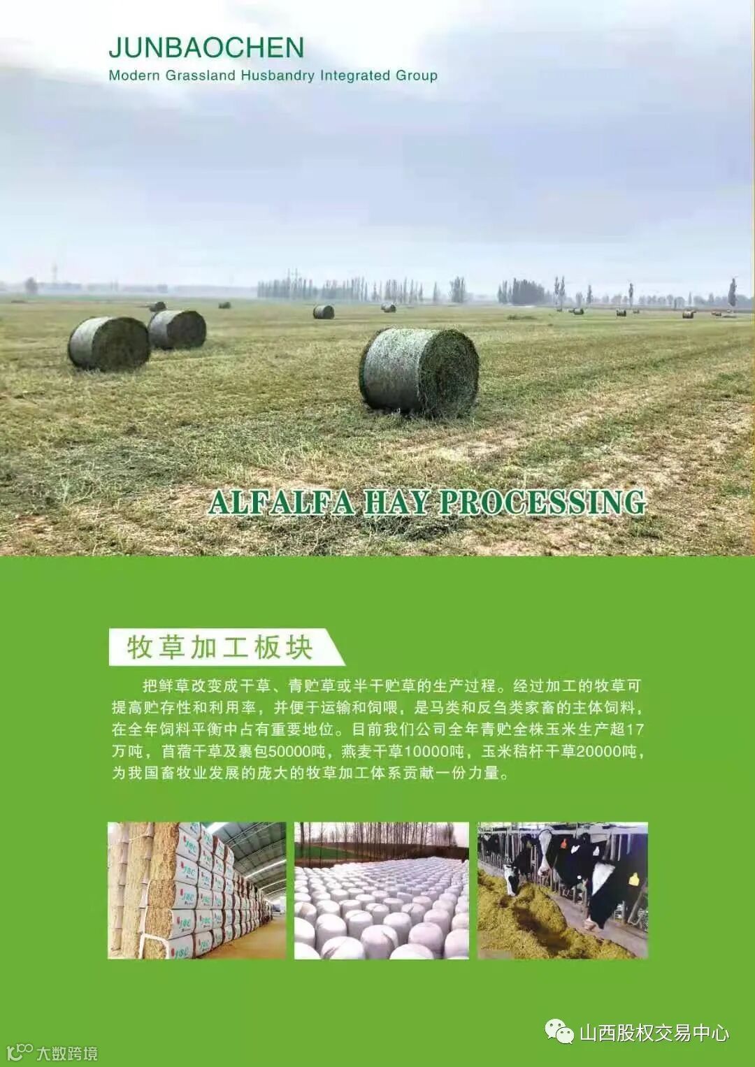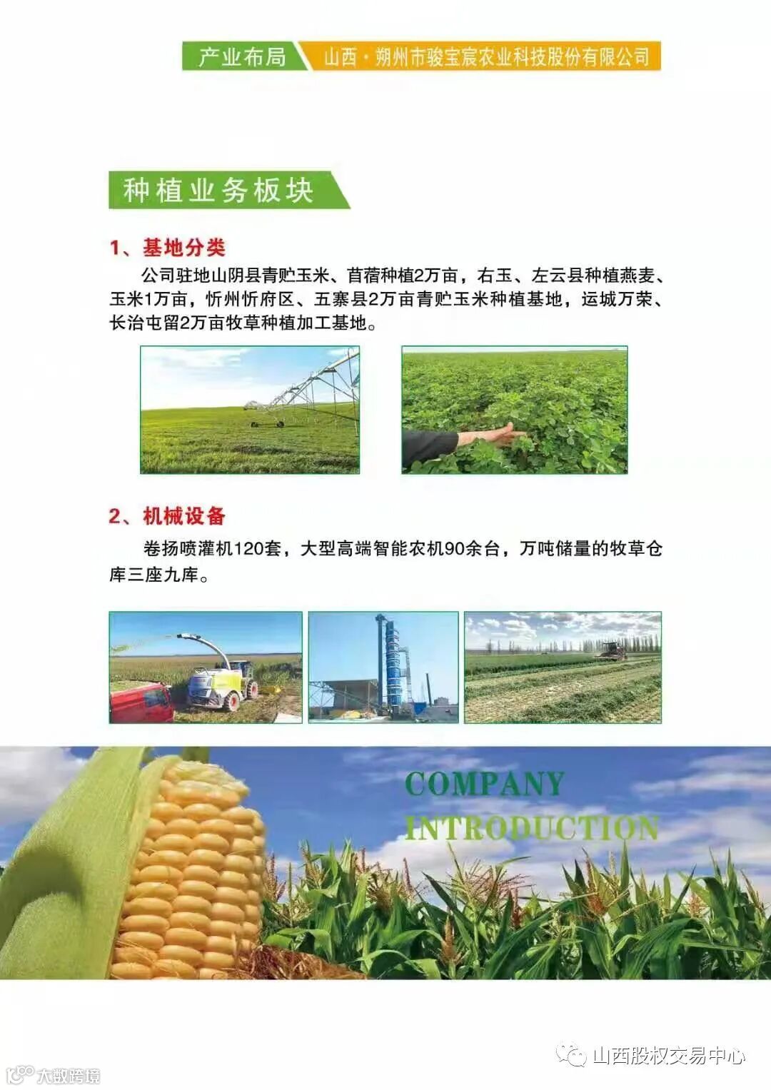 为主业。牧草种植加工基地遍及三晋大地,朔州市范围山阴玉米、苜蓿、燕麦种植面积2万亩,右玉、左云青贮玉米、燕麦草1万亩种植基地,
