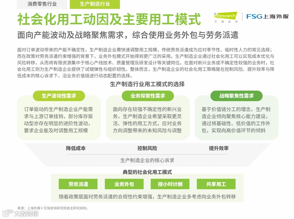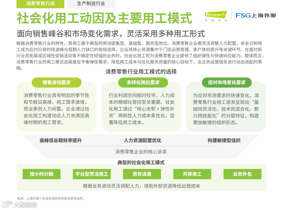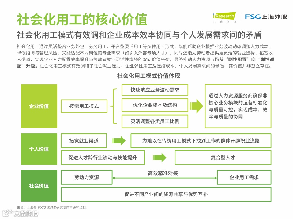 近日,上海外服重磅发布了由上海外服人力资源研究院与上海外服业务外包事业部联合艾瑞咨询(iResearch)共同制作的《中国企业社会化用工趋势分析报告》。报告通过对环境因素、政策指引、市场洞察、行业应用等多个维度的深入研究分析,旨在厘清社会化用工的内涵与外延,为企业人力资源管理创新转型与新质发展提供有价值的参考信息。