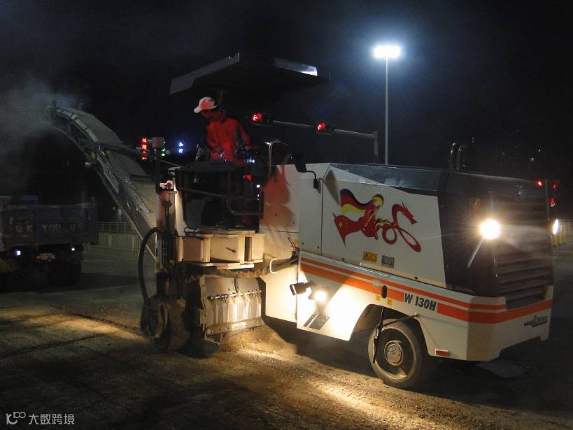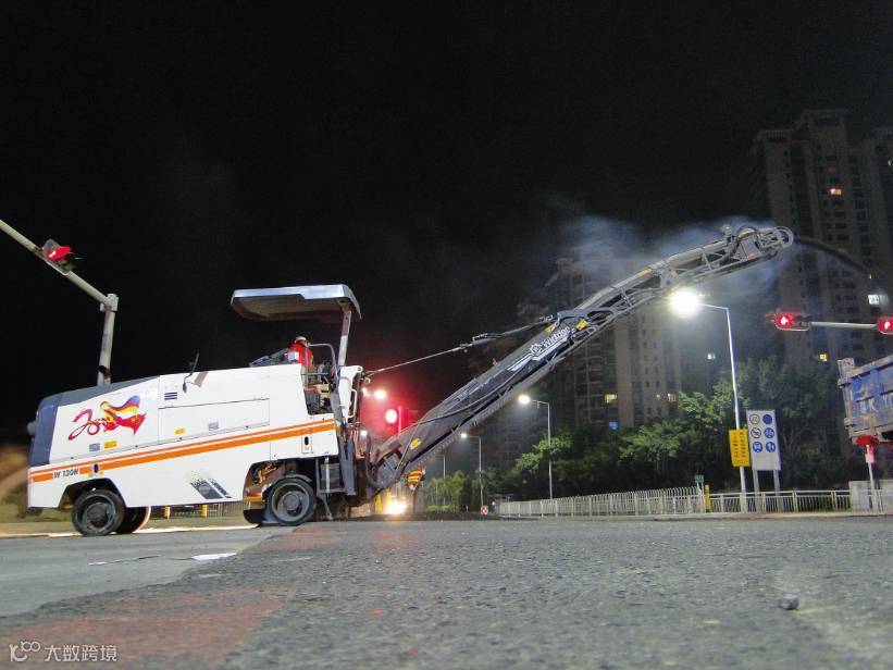 一台 W 130 H 在夜间铣刨 5 cm 厚的广东深圳的受损面层。这项施工由一家私人租赁公司承接。由于这台小型铣刨机装配的完整照明套包,使得夜间施工更加安全。前部的两个头灯、多个灵活的卤素工作灯和一个警示灯对整个施工区域进行全方位照明。