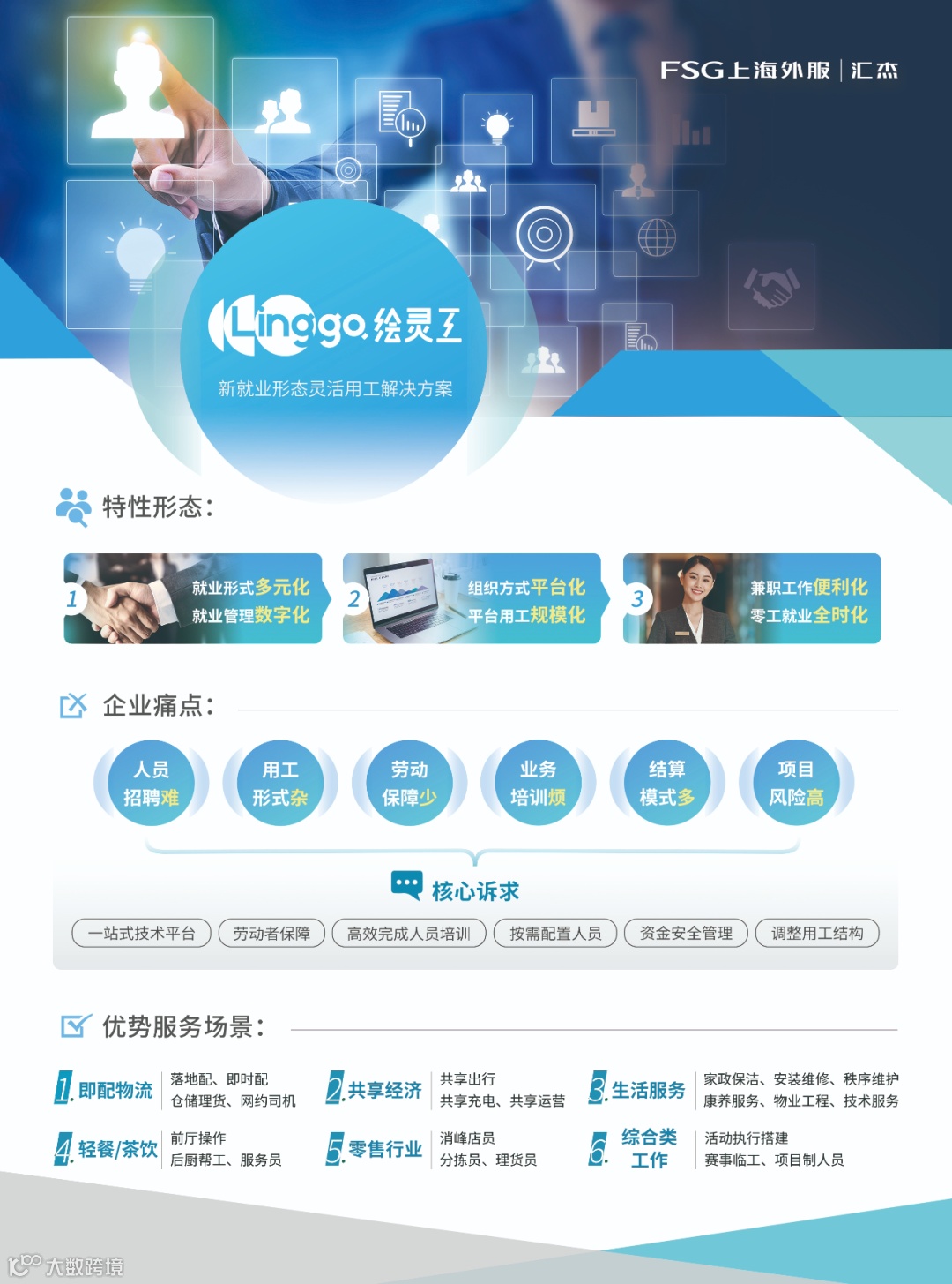 上海外服汇杰信息咨询有限公司(简称:外服汇杰),隶属于上海外服集团业务外包事业部。外服汇杰秉持“技术+咨询+服务”的核心发展理念,以灵活用工、劳务用工为核心,通过多元化用工解决方案,在新就业形态下搭建起企业与人才的沟通桥梁;通过生态化平台与精准匹配策略,高效对接供需侧需求;通过一站式全链路管理服务体系,助力企业优化用工结构的同时,有效保障劳动者权益。凭借对行业发展痛点的深刻洞察,外服汇杰助力劳动者实现精准就业、助力企业聚焦核心发展、助力行业构建绿色生态,为国家规范发展新就业形态、促进高质量充分就业注入强劲动力。