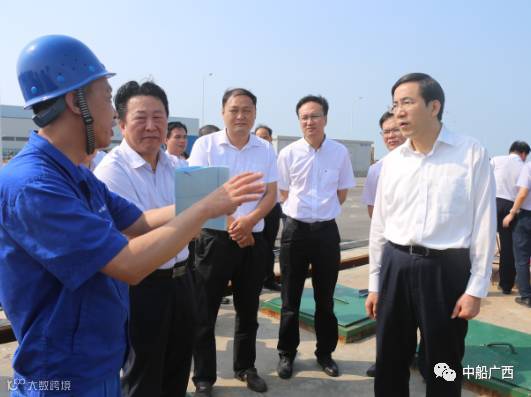黄海昆市长一行首先来到公司直立式驳岸码头,详细了解直立式驳岸码头建设、竣工验收及口岸开放的推进情况。直立式驳岸码头长400米、宽25米,是公司水工工程的主要设施,目前已完成主体工程建设及交工验收,正在申办水工工程交工质量鉴定、临时经营许可、竣工验收及口岸开放等手续。黄海昆市长认真听取了汇报,他表示,中船钦州基地是自治区及钦州市重大工业项目,近年来,中船广西公司领导班子带领广大员工攻坚克难,在项目建设及生产经营等方面都取得了显著进展,如期完成了十万吨级修船生产线试运行,给钦州经济发展带来了新活力和新希望。他要求,市发改委、北部湾港口局钦州分局、市口岸办等部门要加强与中船广西公司的高效对接和无缝衔接,及时解决项目验收及口岸开放存在的问题,确保按既定的时间节点完成项目竣工验收及口岸开放工作,加快实现钦州外轮维修及保障能力。