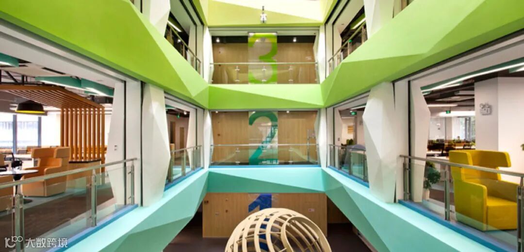 在颜色搭配上,地毯与中空区的浅色调形成强烈对比,创造了一个既生动又富有灵感的工作场所。我们利用建筑的结构优点,并为了更好地展示出每层的特色,采用了3T文化中的几个主色调,不同的色调代表着每层的空间色彩效果。