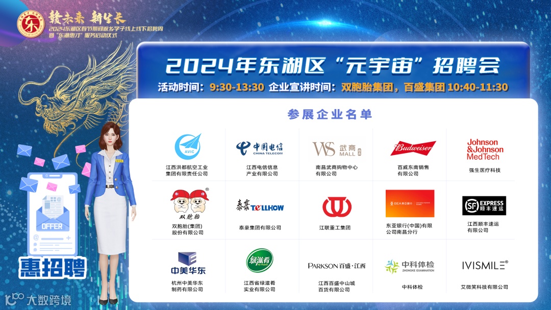 近日,由东浩兰生集团上海外服参与承办的“赣未来 新生长”——2024年江西省南昌市东湖区“凌佳佳元宇宙招聘会”成功举办。龙年伊始,东浩兰生集团便着力促进高质量充分就业,依托“凌佳佳”品牌资源,上海外服与江西南昌东湖区人社局携手创新,用别具一格的“数字化”云端招聘新形式,实现优秀企业与精英人才的“双向奔赴”,助力春节期间返乡学子及务工青年人求职就业。