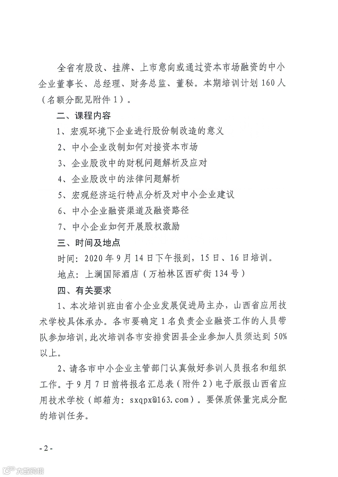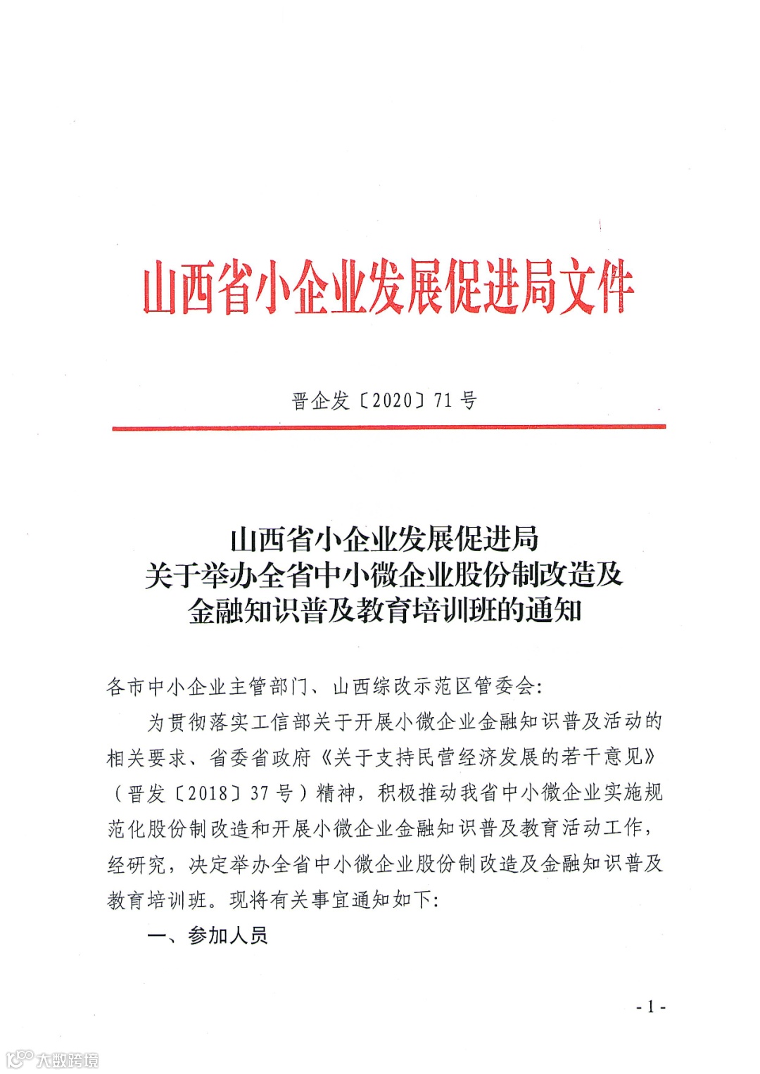山西省小企业发展促进局关于举办全省中小微企业股份制改造及金融知识普及教育培训班的通知