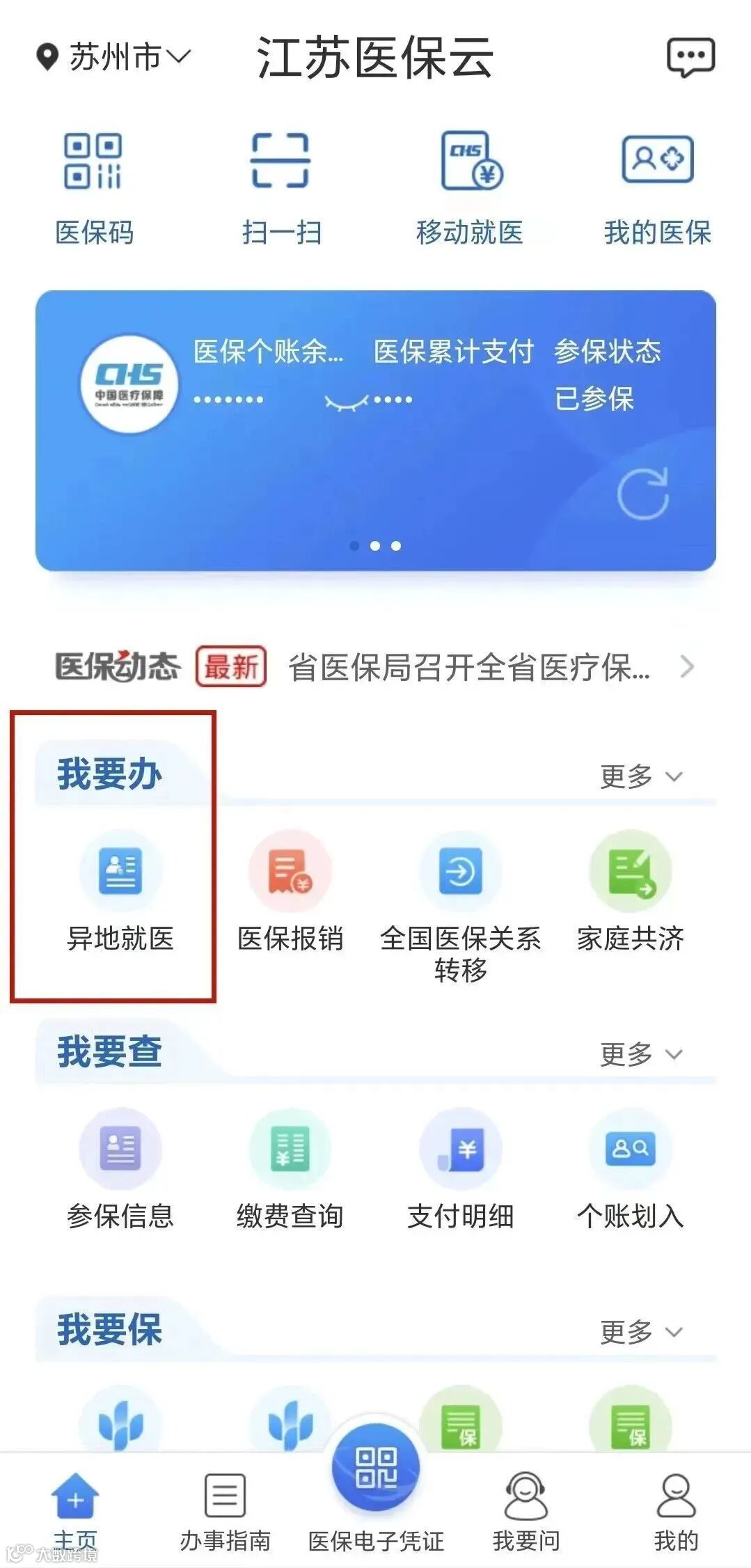 下载“江苏医保云APP”,在“个人中心”注册用户账号,登录后进入“我要办-异地就医”模块。(注:尚未激活医保电子凭证的参保人员需要先行激活医保电子凭证后,再申请办理医保业务。)