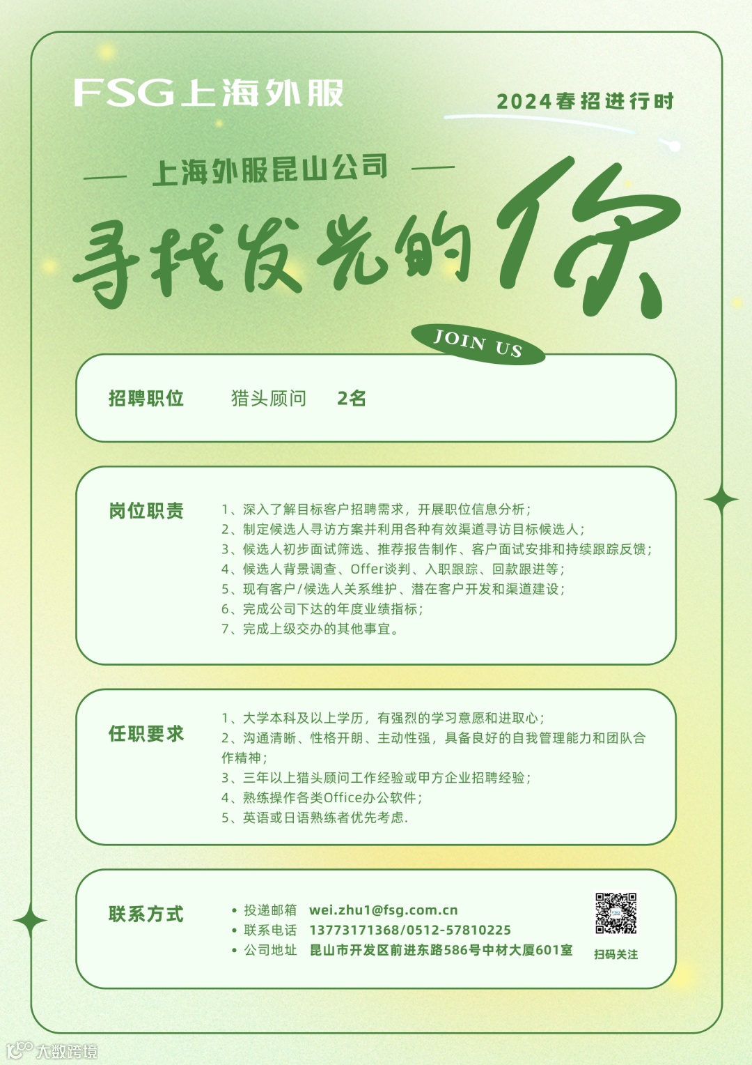 内部招聘 | 上海外服昆山公司猎头顾问热聘中