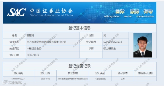 中证协官网显示,王昭凭仅申万宏源证券承销保荐公司一条注册信息,起始日为2009年10月19日,截至目前信息仍在。这意味着,王昭凭在申万宏源承销保荐即将期满十五年。也值得关注的是,王昭凭早年工作的普华永道中天会计师事务所正是申万宏源证券承销保荐有限责任公司的财务