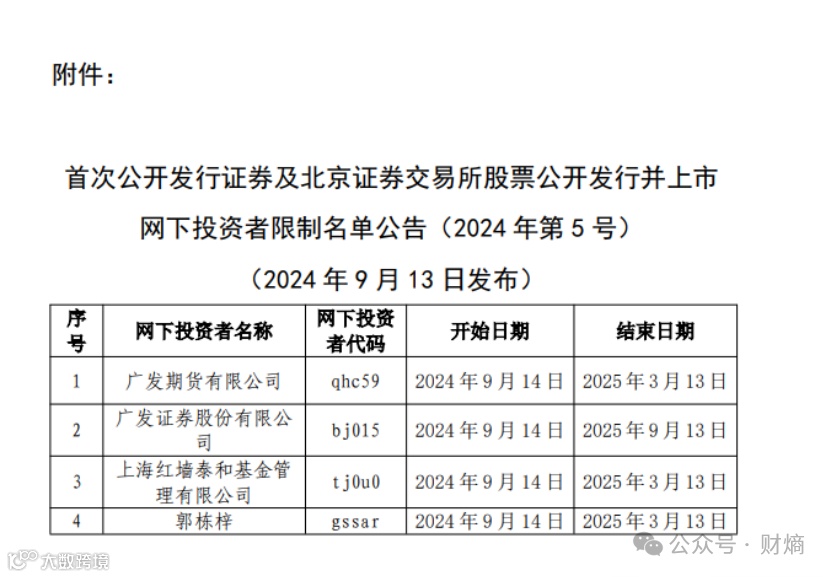名单包括了广发期货、广发证券、红墙泰和基金公司以及个人账户“郭栋梓”等四个网下投资者。