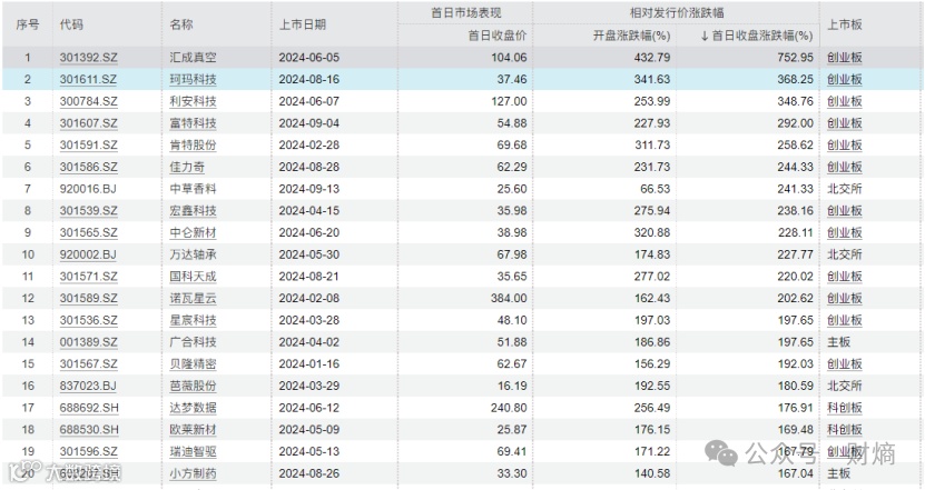 此外,珂玛科技等10只股票上市首日收盘价涨幅都超过200%。