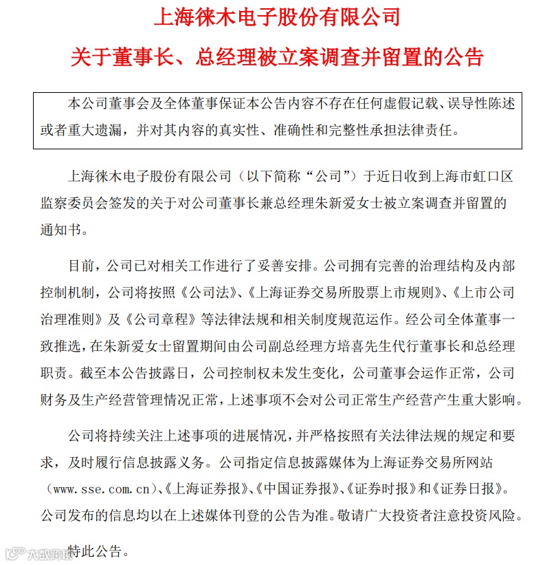 8月19日,徕木股份公告,公司董事长兼总经理朱新爱女士收到上海市虹口区监察委员会签发的立案调查并留置通知书。