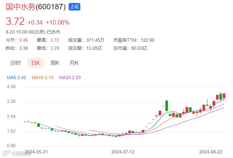 受此消息影响,国中水务的股价随之暴涨,股价从1.71元/股涨到8月23日的3.72元/股。