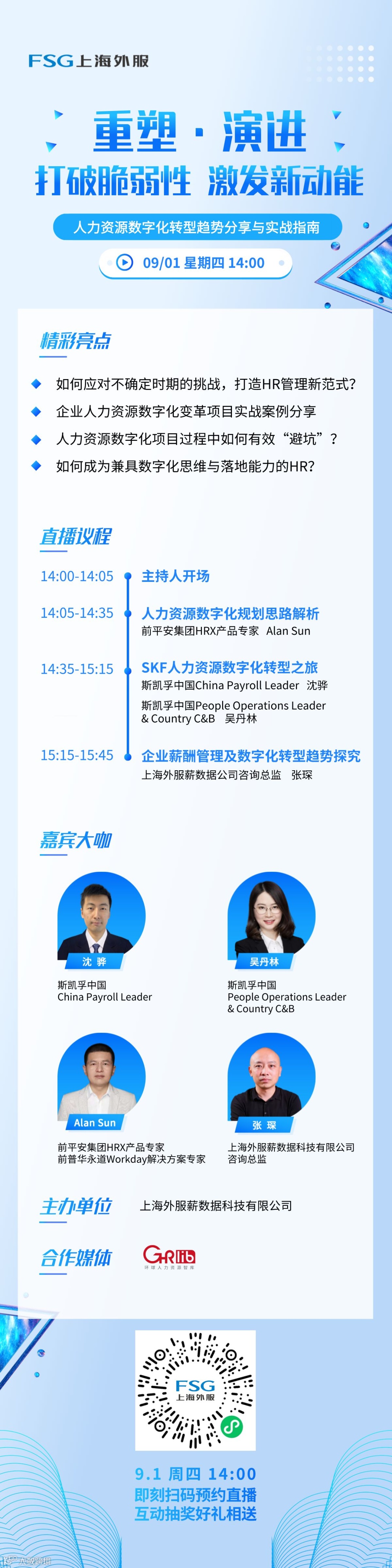 届时,斯凯孚中国China Payroll Leader沈骅、People Operations Leader & Country C&B吴丹林、前平安集团HRX产品专家Alan Sun、上海外服薪数据公司咨询总监张琛将坐镇直播间,围绕人力资源数字化趋势与实战主题进行分享,从战略规划到落地实操,从系统选型到项目实施,为大家带来深度解读与经验分享。
