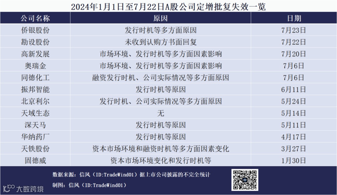 笔者(ID:TradeWind01)据A股公司披露的公告不完全统计,今年1月1日至7月22日,勘设股份、高新发展(000628.SZ)、奥瑞金(002701.SZ)、侨银股份等在内合计12家公司宣告再融资注册批复失效,如此数量已经超过2023年全年的数量。