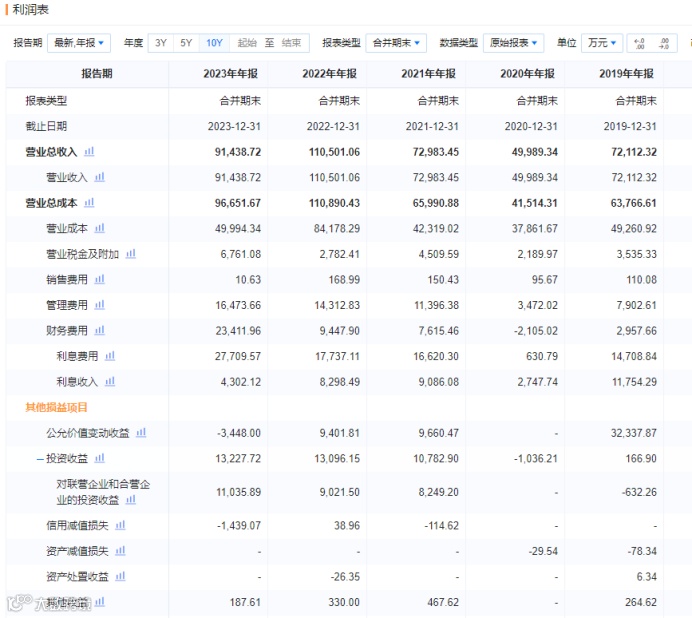 另一项财务数据,即投资收益一项,2019年至2023年,上城区文商旅的成绩分别是167万、-1036万元、1.08亿元、1.31亿元、1.32亿元。