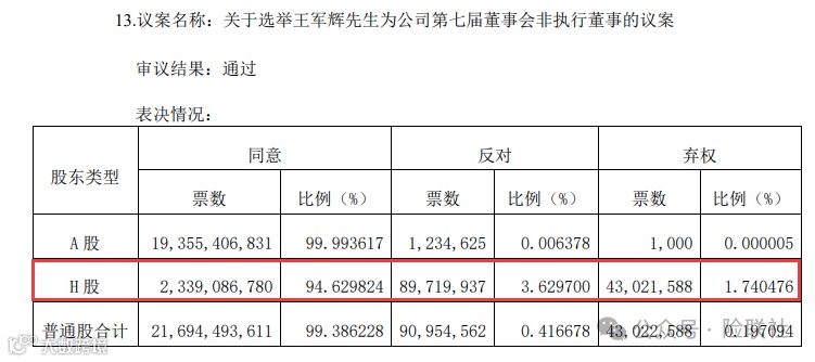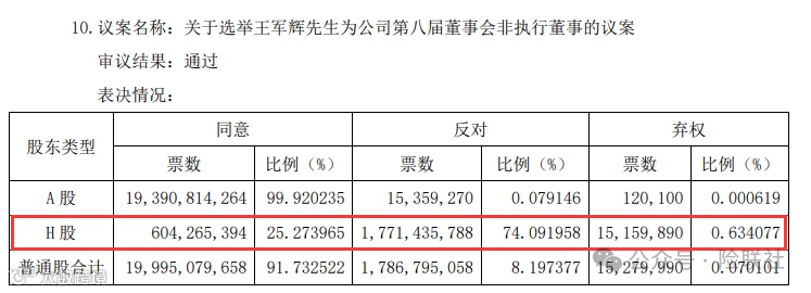 选举王军辉为第八届董事会非执行董事的投票时,参与投票的H股反对票高达74.09%。