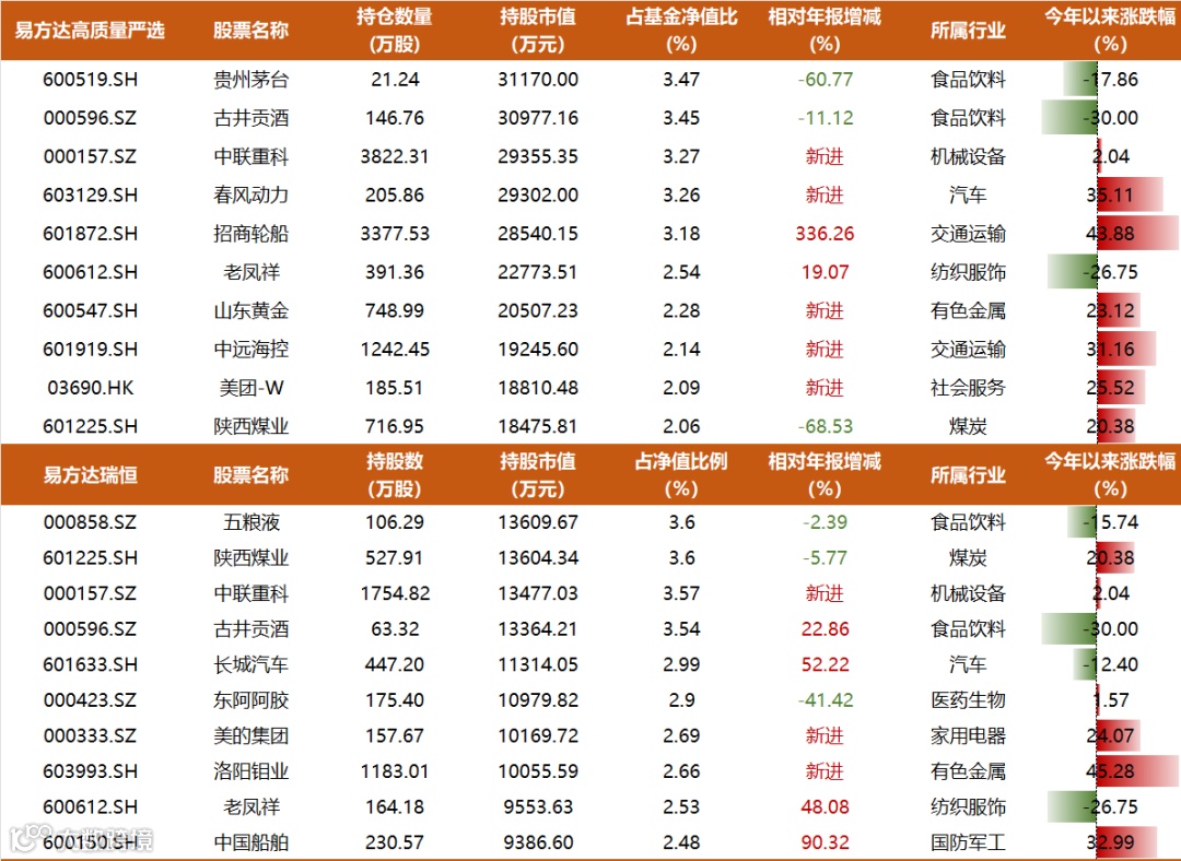 比如,在易方达高质量严选和易方达瑞恒中,贵州茅台分别被减掉了60%、30%,幅度不小;
