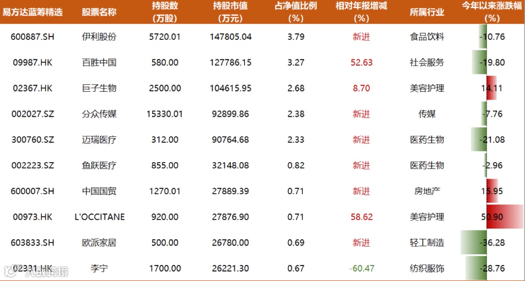 但李宁并没有被完全清仓,易方达蓝筹精选的腰部股中依然保留着这支标的,但其持股数量相较于去年末减少了六成。