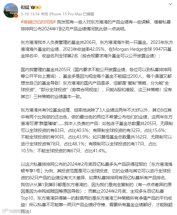 对此,许多投资者对排名所涉及的产品业绩有所疑问,但斌也在自己的微博进行了回复。