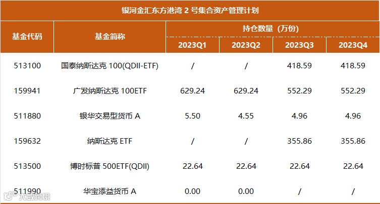 唯有一点不同在于,“银河东方港湾2号”的持仓中也有少量的标普500ETF,这部分持仓在2023年全年并未发生变化。