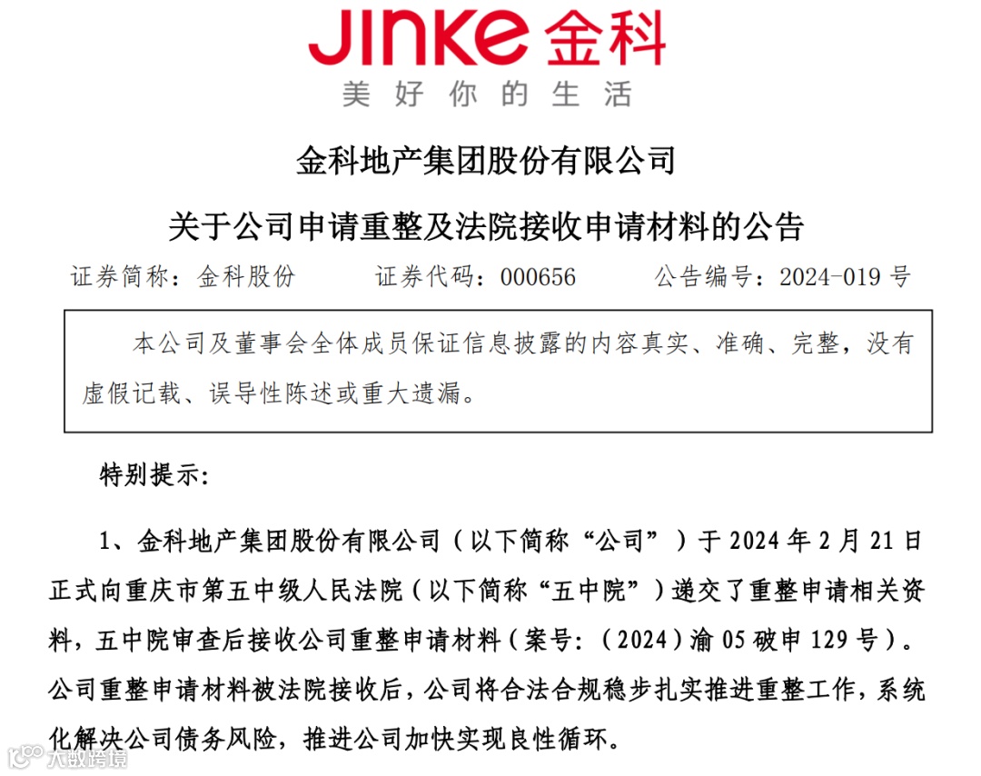 房地产企业代表,寒冬之中,金科股份在龙年开年,正式提交了重整申请。