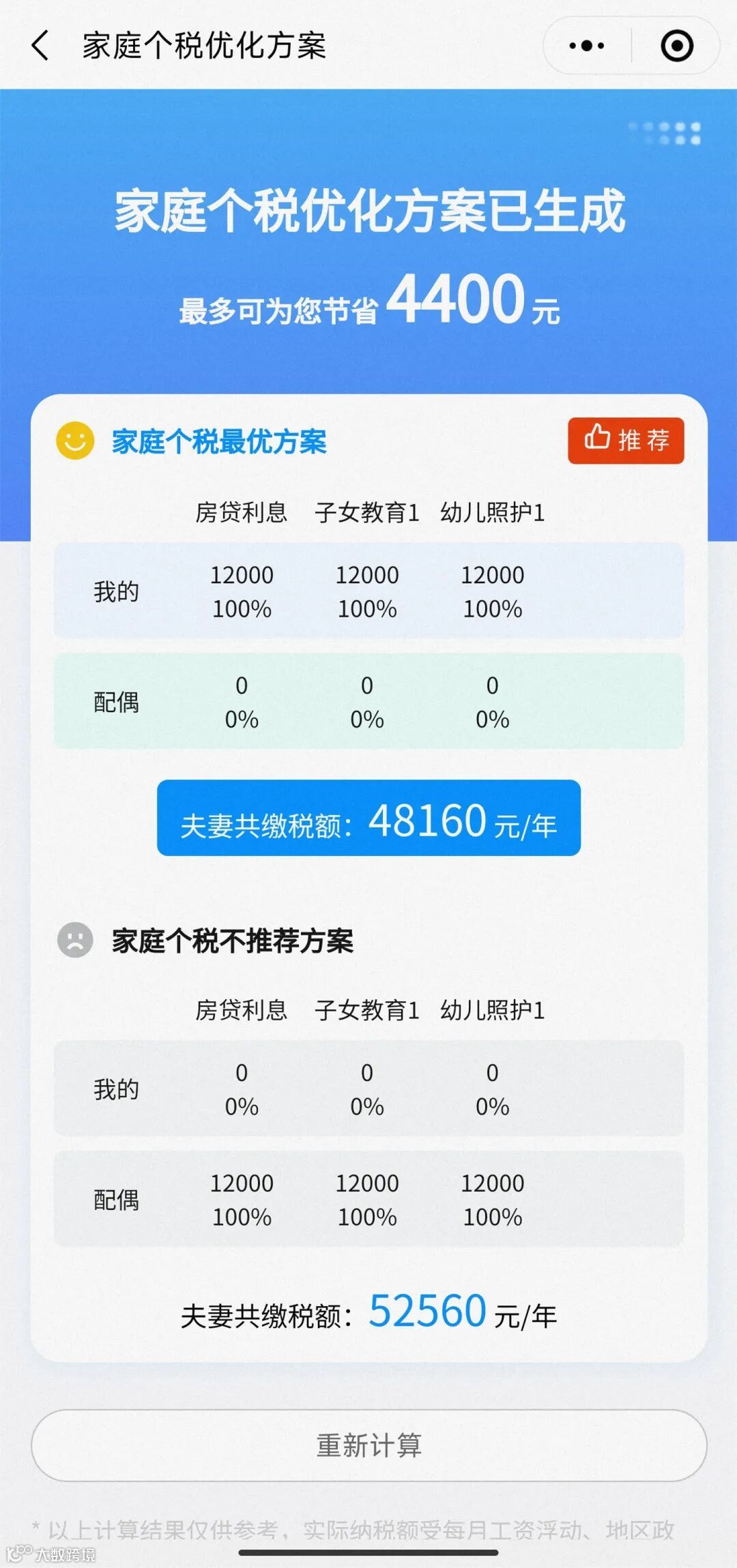 按上面例子中的收入和家庭情况,用家庭个税优化计算器就可以轻松得到推荐的最佳专项附加扣除夫妻分配方案:
